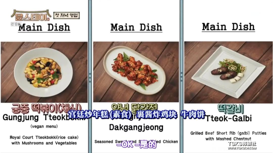 第一天的三大主菜是宫廷炒年糕,裹酱炸鸡块和牛肉饼。
