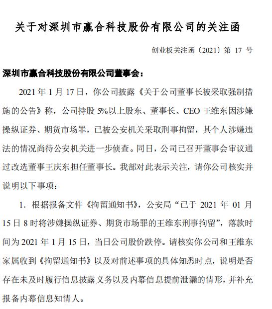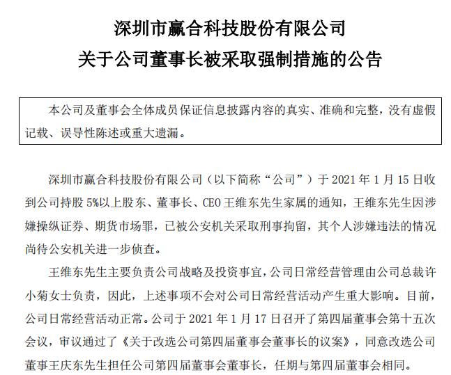 而被套的小散又遭重创。1月17日晚间,赢合科技公告称,公司于15日收到持股5%以上股东、董事长、CEO王维东先生家属通知,王维东先生因涉嫌操纵证券、期货市场罪,已被公安机关采取刑事拘留,其个人涉嫌违法的情况尚待公安机关进一步侦查。