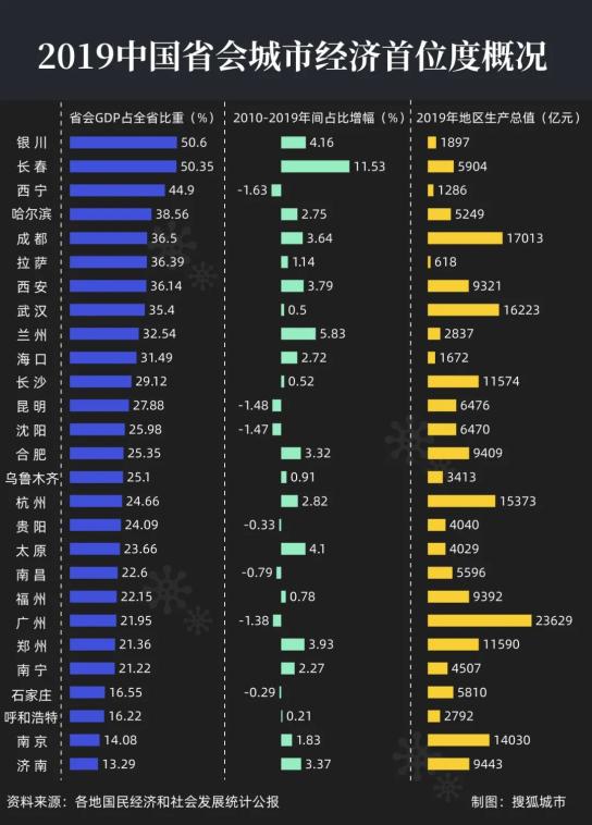 2019中国省会城市经济首位度概况/搜狐城市制图2019年,银川全市地区生产总值为1897亿元,占宁夏全区经济总量的一半以上,经济首位度全国第一。