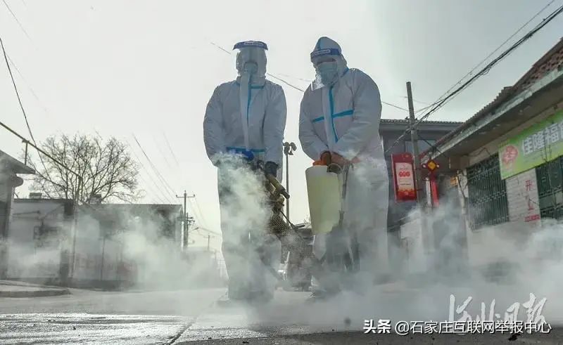 近日,工作人员在藁城进行消杀。河北日报记者 赵杰摄确诊病例轨迹中的部分区域和隔离点都会做严格消毒