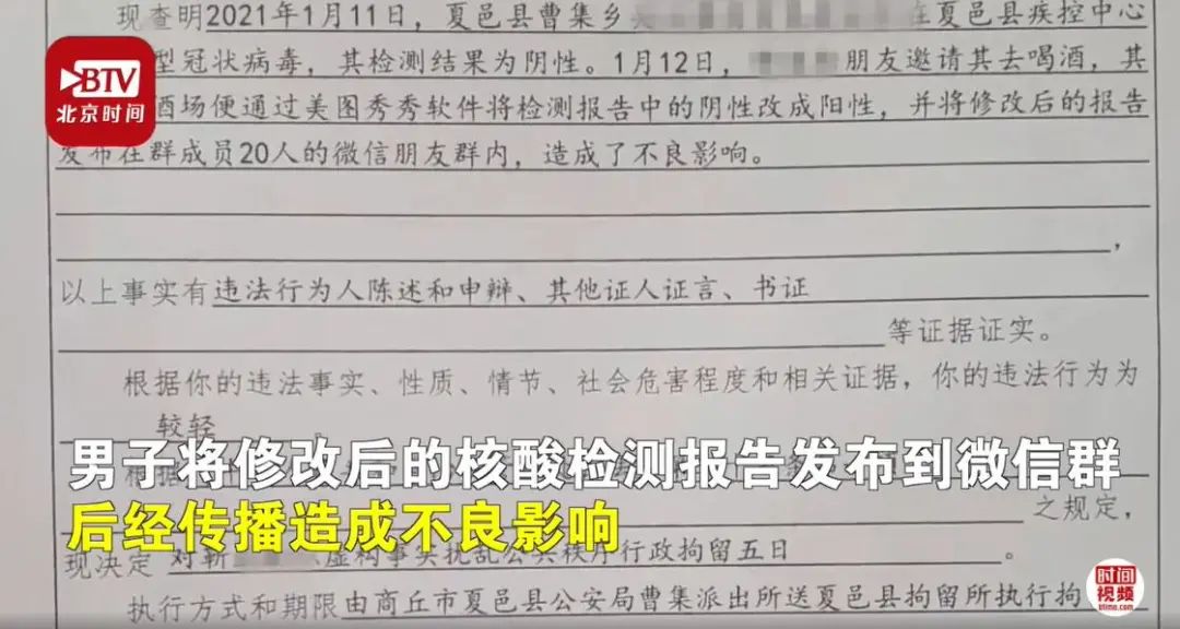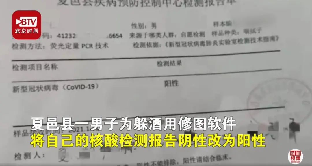 2021年1月11日,河南省商丘市夏邑县一男子为躲酒局,用修图软件将自己的核酸检测报告阴性改为阳性并发布到微信群,造成不良影响。男子称,直接拒绝怕失面子伤和气,想P图以假乱真。目前,该男子因违反《治安管理处罚法》故意扰乱公共秩序被处5日拘留。