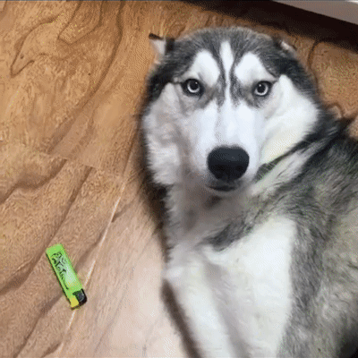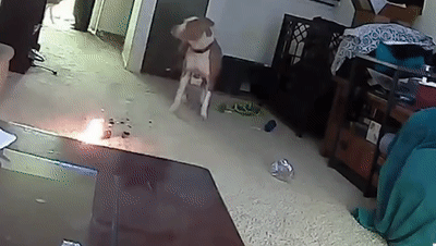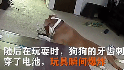 狗狗趴在客厅里啃咬玩具不小心牙齿刺穿电池