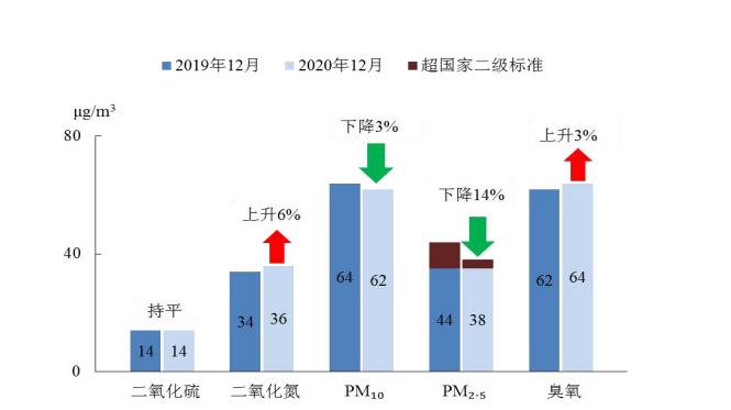 辽宁省大连生态环境监测中心监测数据显示,2020年12月大连市区空气质量优15天,良11天,污染日5天,达标天数比例为83.9%,同比上升6.5个百分点;空气质量整体改善,PM2.5和 PM10浓度同比下降14%和3%,二氧化硫浓度同比持平,二氧化氮和臭氧浓度同比上升6%和3%。