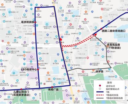 电脑城往万达广场方向,沿原线运行至儿童公园北门站后,经西陵一路、东山大道、绿萝路、体育场北路绿萝植物园站恢复原线。临时取消体育场北路(715创意园)站、CBD商务中心站,临时增加夷陵广场站、绿萝路站。