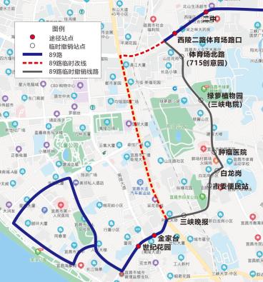 临时取消体育场北路(715创意园)上下行站、绿萝植物园(三峡电院)上下行站、肿瘤医院上下行站、白龙岗上下行站、市委便民下行站、三峡晚报上下行站共11个站点。