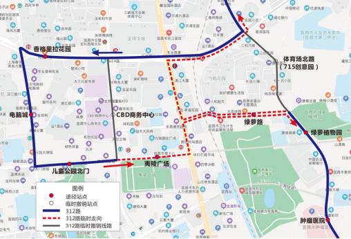 万达广场往电脑城方向,沿原线运行至绿萝植物园站后,经体育场北路、绿萝路、东山大道、西陵二路、华祥恢复原线。临时取消体育场北路(715创意园)站,临时增加绿萝路。