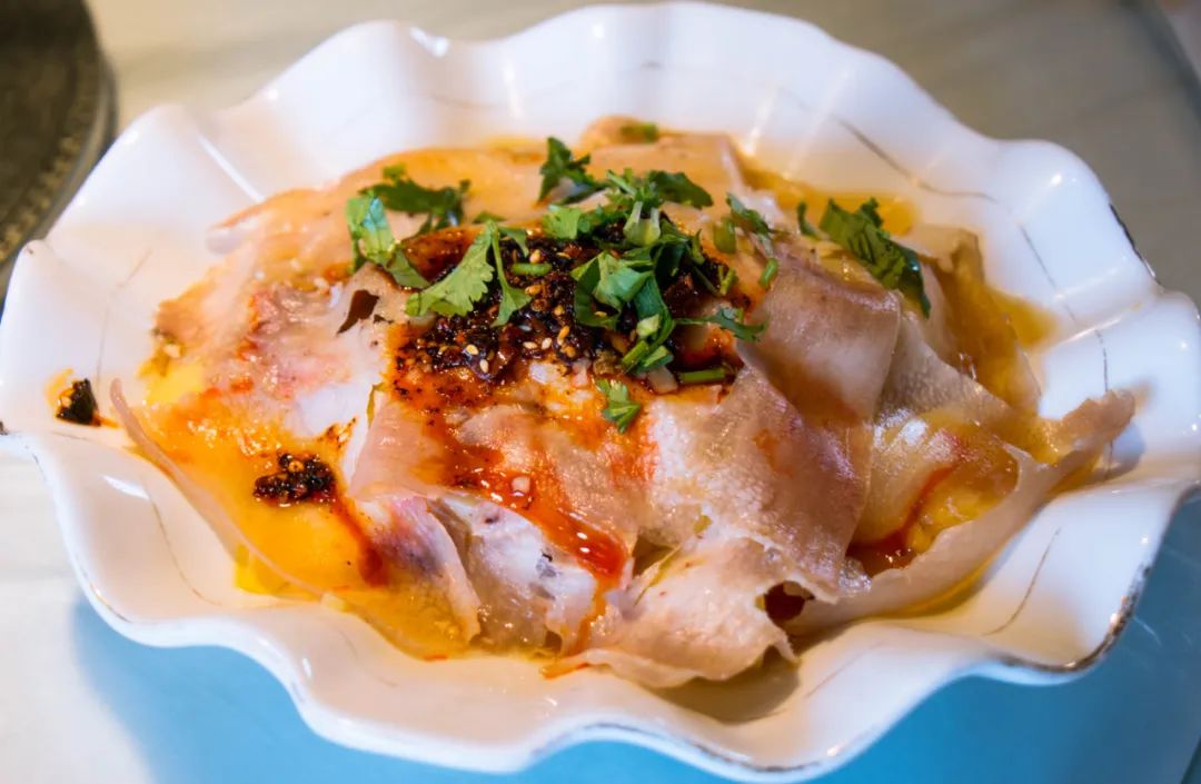 大薄片大薄片为滇西名菜,工于火候,长于刀法,用特制的猪头肉,片的大薄片大如手掌,薄如蝉翼,放入特制蘸水中一涮,不油不腻,脆嫩鲜爽,回味无穷。