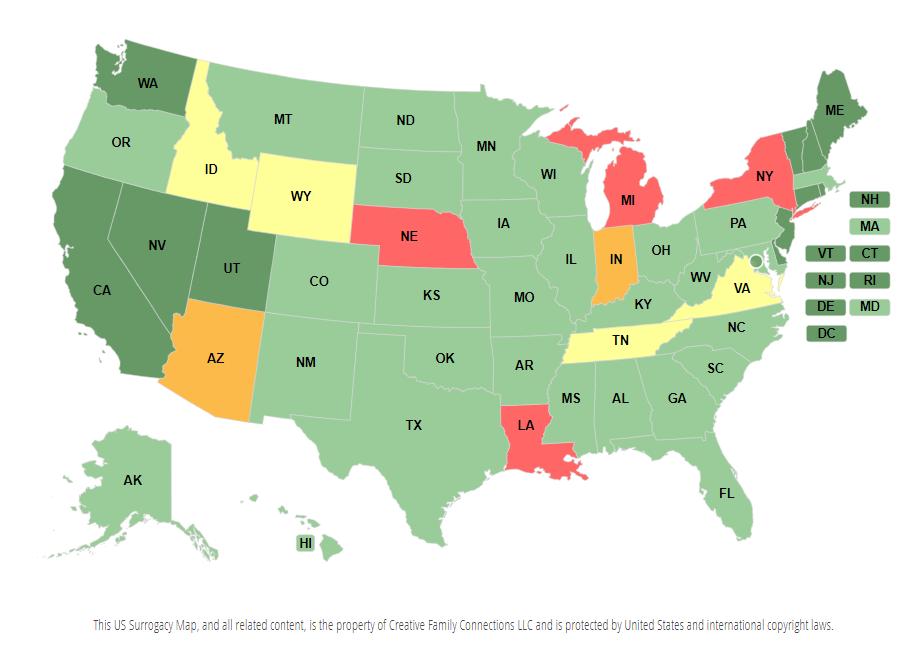 代孕法是在美国州一级的政府实施的,并不是所有的州都可以合法代孕:深绿色州属于代孕合法且接受度高,