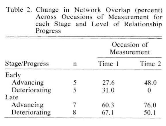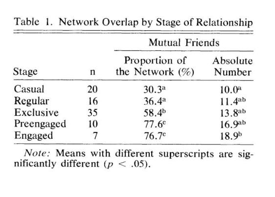 Robert M. Milardo教授(1982)招募了89名大学生,研究在亲密关系的不同阶段中,共同好友的数量会不会发生变化。他首先统计了在被访当中,伴侣之间的关系网络重叠率(network overlap)有多高。重叠率越高,意味着在双方的关系网中共同好友的数量越多。