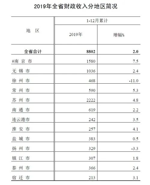 根据官方数据,2019年江苏全省一般公共预算收入完成8802亿元,增长2.0%。其中,税收收入完成7340亿元,增长1.0%;非税收入完成1462亿元,增长7.0%。全省税收占比为83.4%。2019年,全省一般公共预算支出完成12574亿元,增长7.9%。