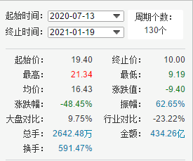 高伟达自去年7月13日摸高21.4元后,股价便一路下挫至2021年1月14日的新低10.4元,区间跌幅达48.45%。