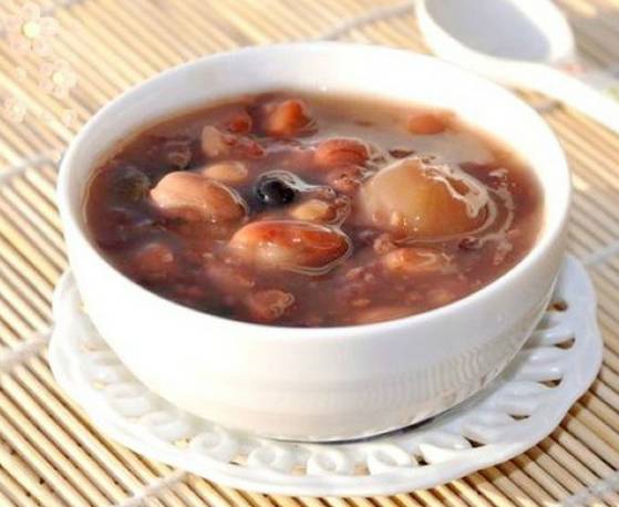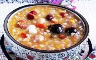 原料:大米30克、小米30克、糯米30克、薏米30克、赤小豆30克、绿豆30克、红芸豆50克、莲子40克、枣20克、桂圆肉30克、花生仁30克、玉米糁50克。做法: