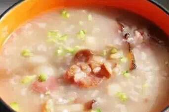 4. 待粥煮至7成熟时,将香肠、腊肉片、海米一起放入米粥内,小火煮至米粒开花,肉片熟烂即可。