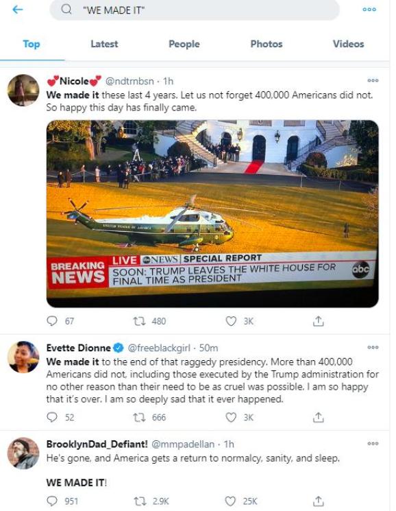“我们做到了”、“特朗普走了”、“史上最差的总统”…..这些,都是今天拜登宣誓就职总统前,美国社交网站“推特”上最热门的话题。