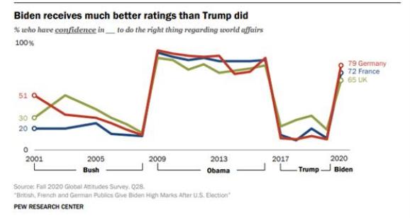 在国际上,众多美国的盟国亦对拜登的到来表现出了明显的欢迎和期盼。美国民调机构皮尤昨日发布的一项民意调查就显示,79%的德国受访者,72%的法国受访者以及65%的英国受访者都对于拜登会做出有利于世界局势的事情而充满信心,这些国家更分别有多达84%和72%的受访者认为拜登会维护好美国与这些国家的关系。