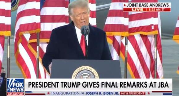 而当他乘坐陆战队一号直升机抵达安德鲁斯空军基地后,他又在一段告别演讲中透露,他“会以某种形式重新回来”,并称他会一直为支持他的人而战斗。