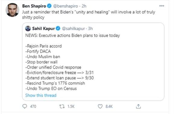 不过,这些保守派公知并没有因为特朗普的“下场”,就转变了他们的价值观。从这些人的社交账号来看,他们依然不愿意拜登是美国的新总统,也不认为拜登在就职演讲中反复提到的“团结”真能让分裂的美国重新团结起来。其中一个保守派公知就表示,当拜登在就任的第一天就要废掉一系列被保守派支持的特朗普的政策,并宣布一系列被保守派厌恶的自由派政策时,这怎么可能会让美国重新团结起来?