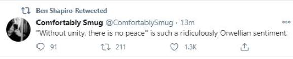 另一名保守派公知更是讽刺说,拜登在谈到“没有团结就没有和平”时的样子,让他想起了乔治奥威尔所描述的反乌托邦世界。