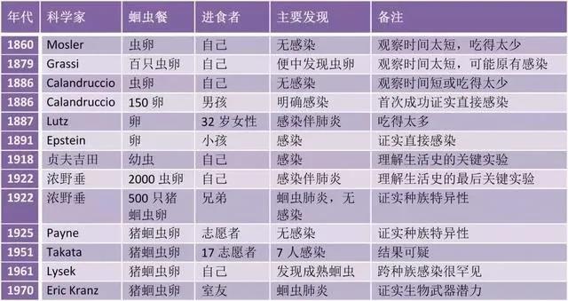 比如,意大利学者格拉西(B. Grassi)一次吞下上百枚虫卵,虽然在22天后发现了虫卵,但是虫卵发现的时间太短,被认为是之前就吃了不洁的食物,证明失败。