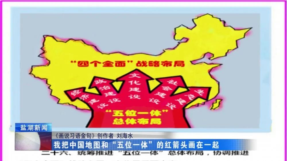 《画说习语金句》创作者 刘海水我把中国地图和“五位一体”的红箭头画在一起,像是一棵大树。树身上是党的十九大提出的“五位一体”总体布局,每个相似树枝的小箭头上写着:“经济、政治、文化、社会、生态”五个建设,这“五位一体”的总体布局箭头,正是推进我国“四个全面”的战略布局。