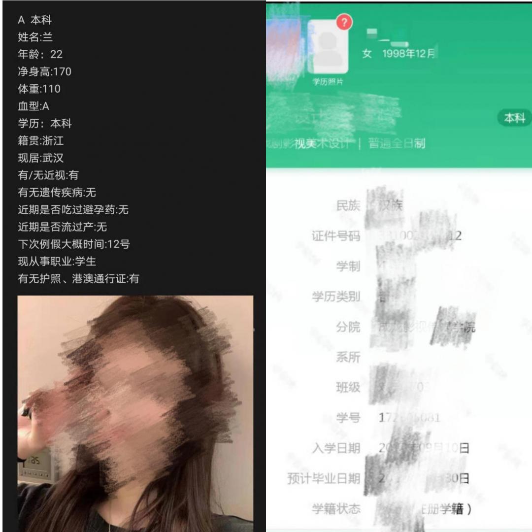 随后,小李发给了记者一名供卵大学生的基本资料,资料显示,这名仅22岁的大学生身高170cm,目前本科在读,除此之外,资料内还显示了该学生的多张生活照片、血型、籍贯、近期是否吃过避孕药、下次例假的大概时间以及有无护照等内容,还出示了该学生学生证件,包括学校名称、学号、入学日期等信息。