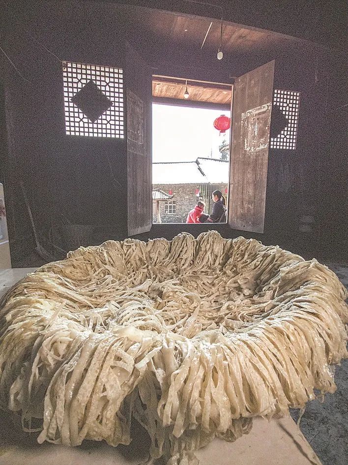 过去,对于生活清苦的山里人来说,豆皮不仅是美食,还是拿得出手的礼品。腊月一过,许多恩施人家就要开始准备豆皮了。将浸泡好的原料用吱吱嘎嘎的石磨碾成稀稠合适的米浆,再以干木柴混以干松针为燃料,在大铁锅底抺上少许猪油,用一漏斗状容器将米浆以同心圆线条形式滴入锅中,只需三五分钟,豆皮就烙熟起锅。一缕缕成型的豆皮放在竹簸箕里晾干后再一扎扎捆起来,成为山里人走亲访友时的馈赠佳品。