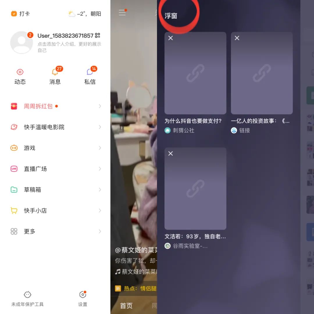 浮窗的这次调整,让微信更接近一款手机基础系统的模样。这种产品设计,在快手身上能看到身影,它很早就采用了左滑显示其他菜单栏的想法,而且在左右页面中,还镶嵌着多级别页面。
