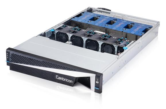 寒武纪智能加速卡MLU290-M5寒武纪玄思1000智能加速器,在2U机箱内集成4颗思元290智能芯片,高速本地闪存、Mellanox InfiniBand网络,对外提供高速MLU-Link™接口,打破智能芯片、服务器、POD与集群的传统数据中心横向扩展架构,实现AI算力在计算中心级纵向扩展,是AI算力的高集成度平台,最大AI算力超过4100万亿次每秒(4.1 PetaOPS INT4),一台玄思1000计算单元就足以替代一个小型传统超级计算中心。