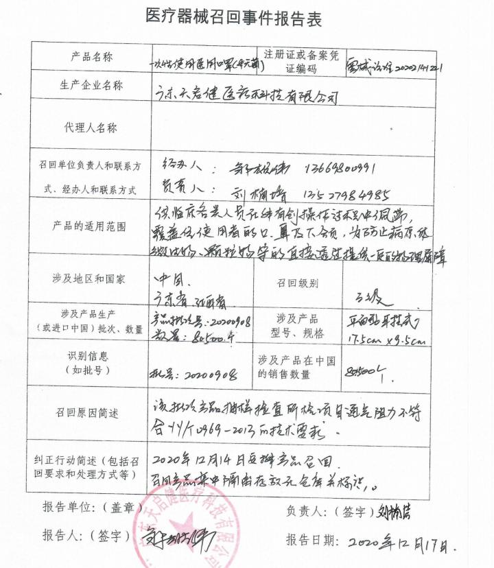 济源市康安卫材有限公司报告,由于其生产的一批次一次性使用医用口罩口罩带和通气阻力不符合规定,企业对其主动召回,召回级别为三级。召回产品的型号、规格为平面型、大号;生产批号为20200515,数量18000个。