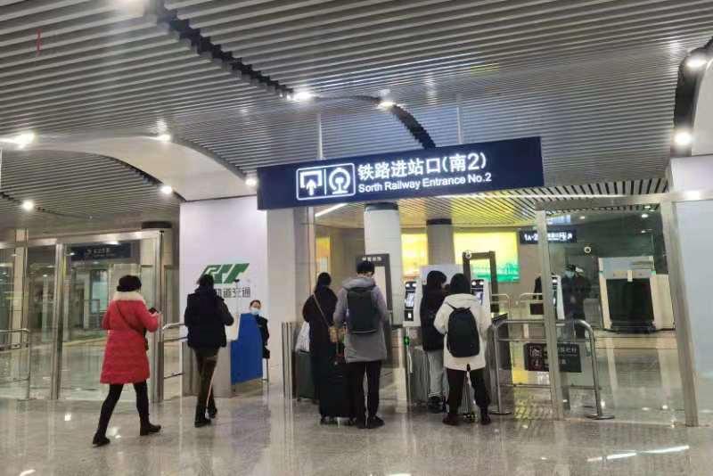 地下通道入口,可进入南站下方新增设的换乘厅。任天驹 摄此次升级改造,南站房下方增设地下换乘厅,让铁路交通与城市交通通过地下换乘大厅实现平层无缝换乘,以后旅客坐3号线、10号线、环线轨道交通,可通过地下换乘厅直接进南站房铁路候车大厅,无需再到地面广场转换进站;坐火车的乘客从南站房出站后,也可以不再安检,直接进入轨道车站乘坐轨道交通,或通过换乘大厅换乘公交车和长途客车。