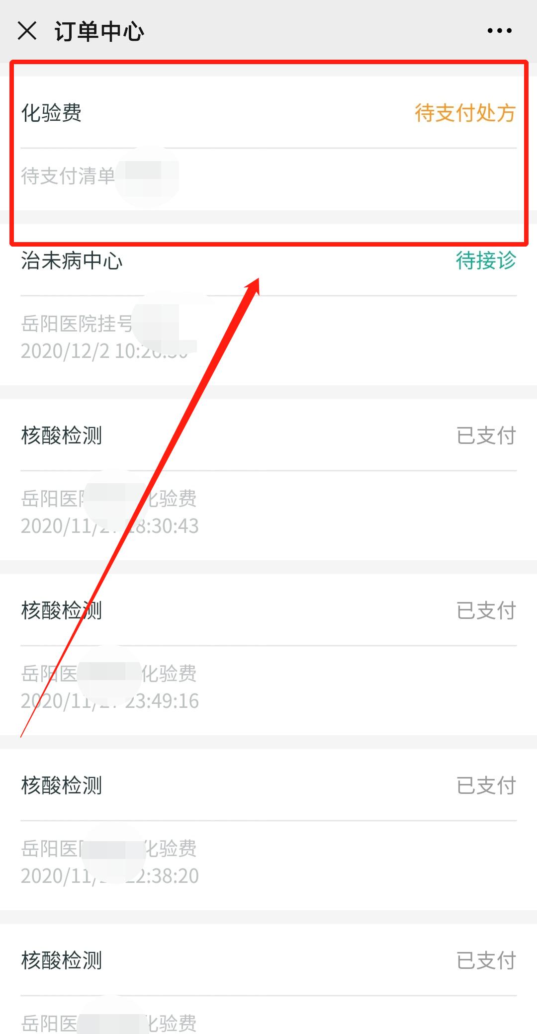 ⑬ 跳转订单中心后选择待支付化验费