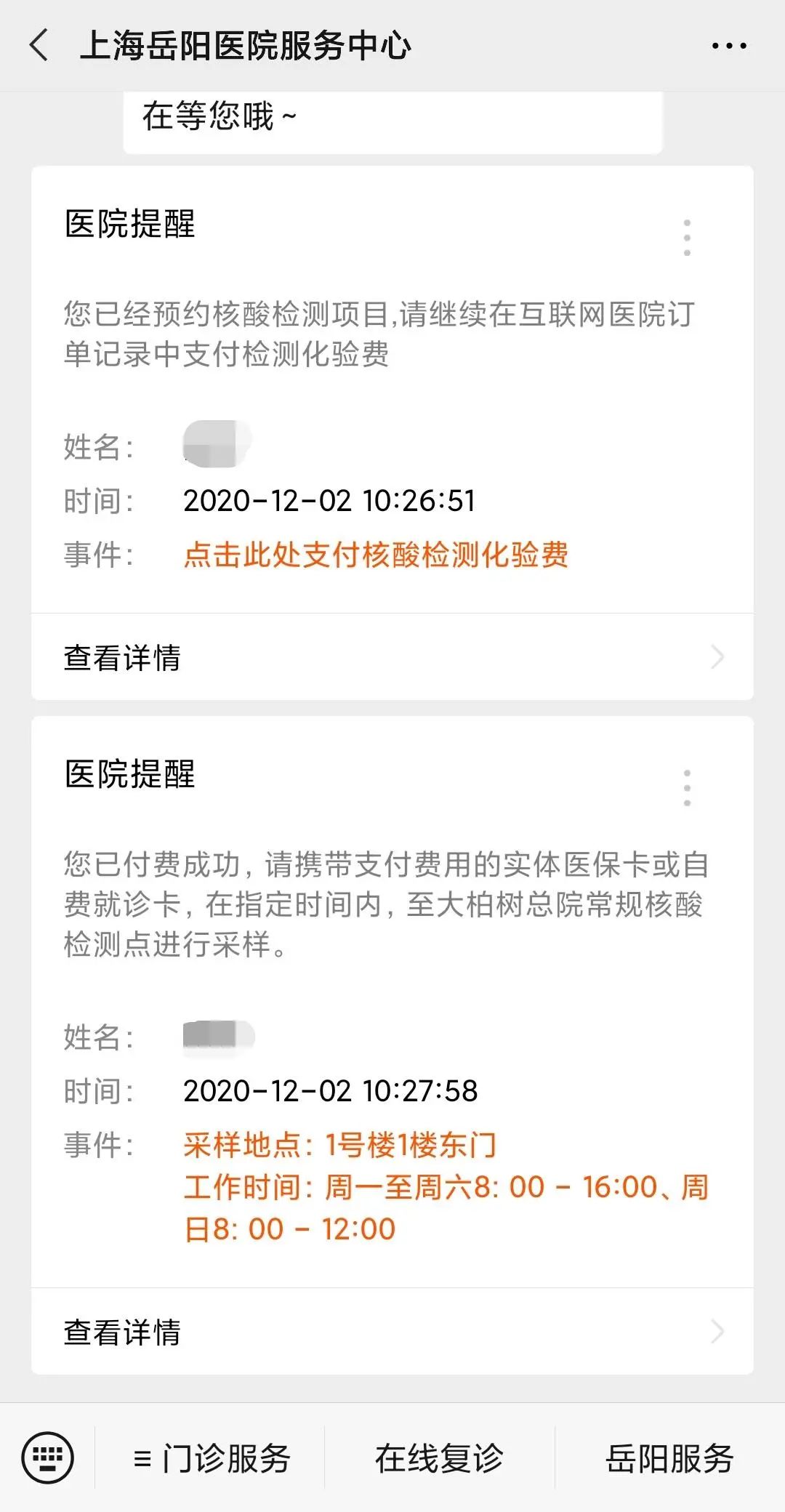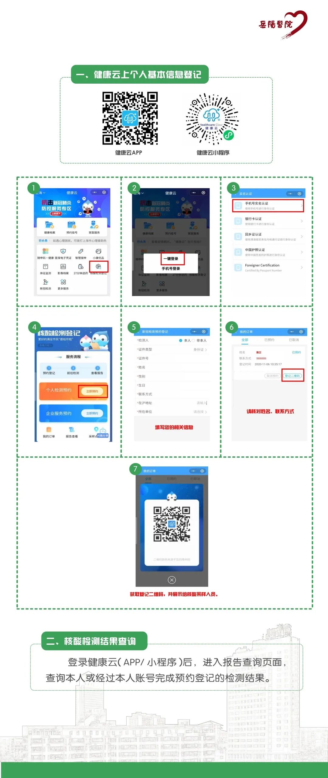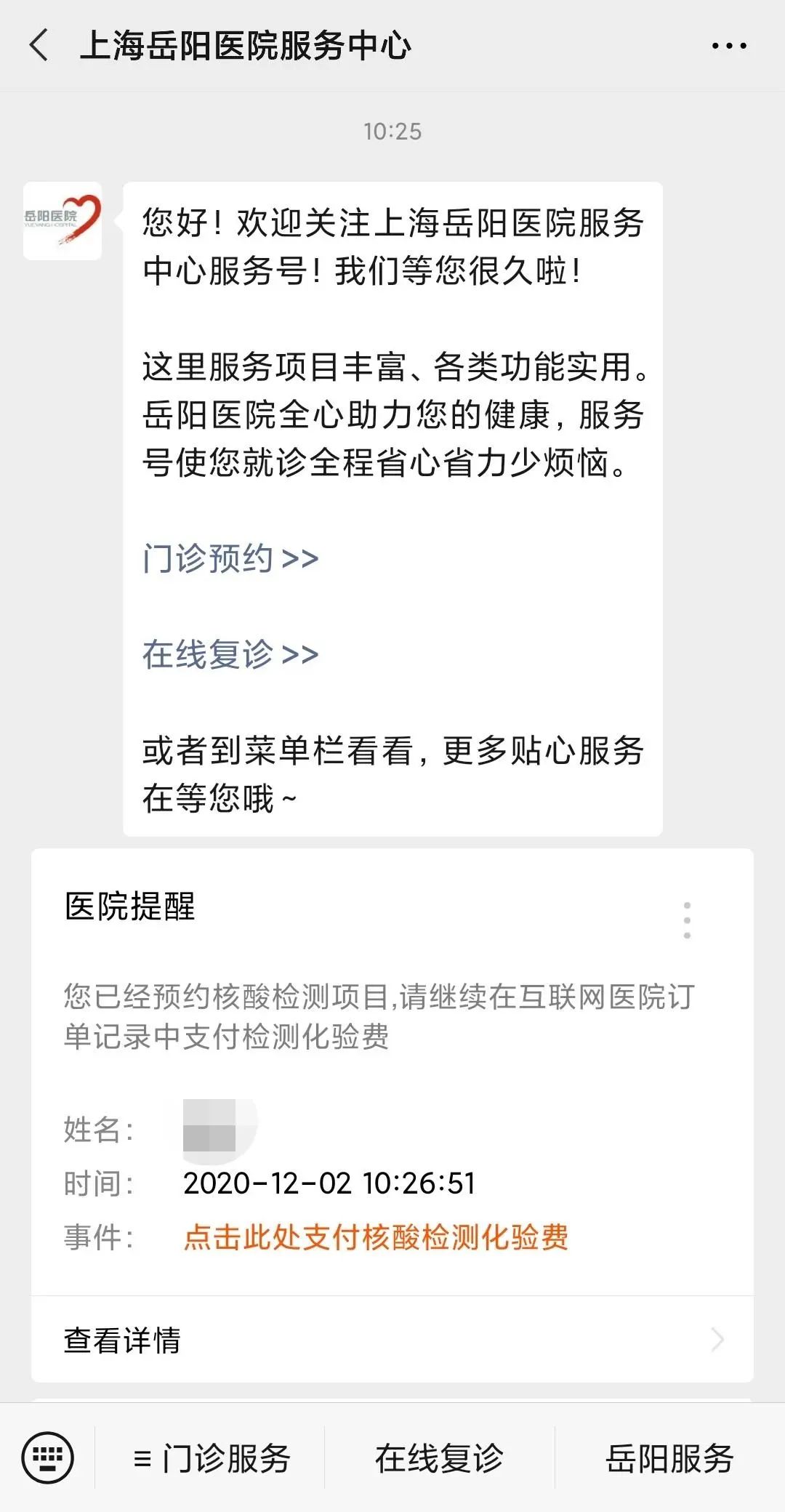 微信扫码关注服务号“上海岳阳医院服务中心”,在“岳阳服务”-“我的就诊人”绑定就诊卡后,点击“我的报告”在线查询检验报告。