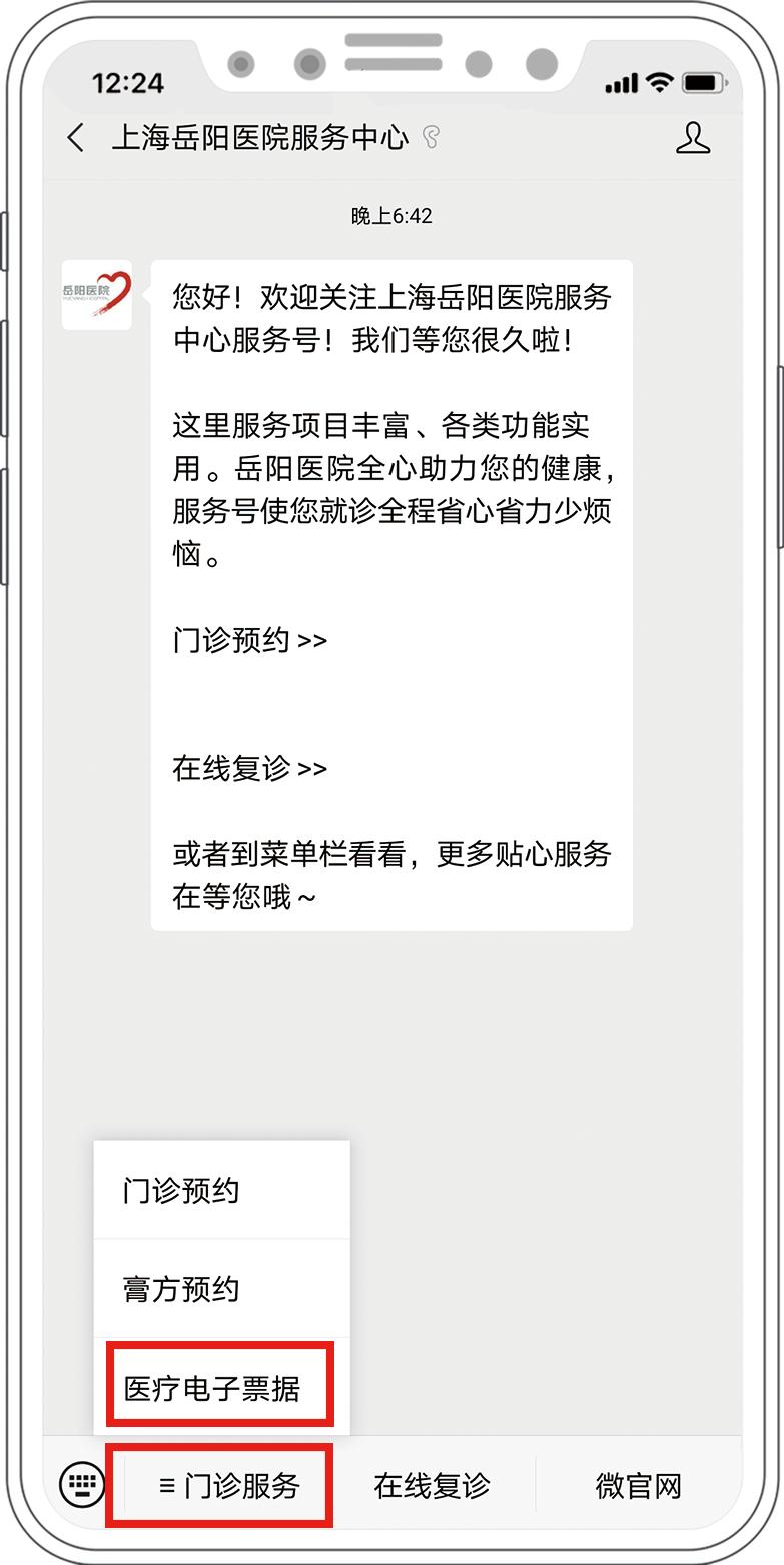 搜索关注“上海岳阳医院服务中心”,选择“门诊服务——医疗电子票据”查看电子票据。