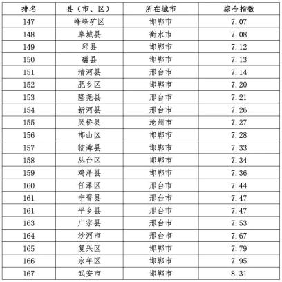2020年12月全省167个县(市、区)空气质量综合指数排名