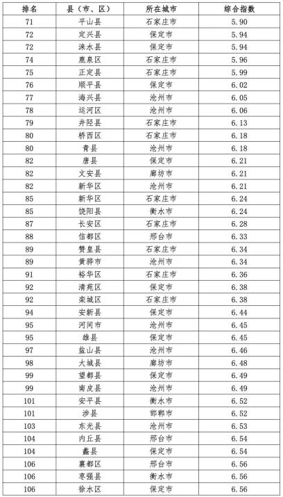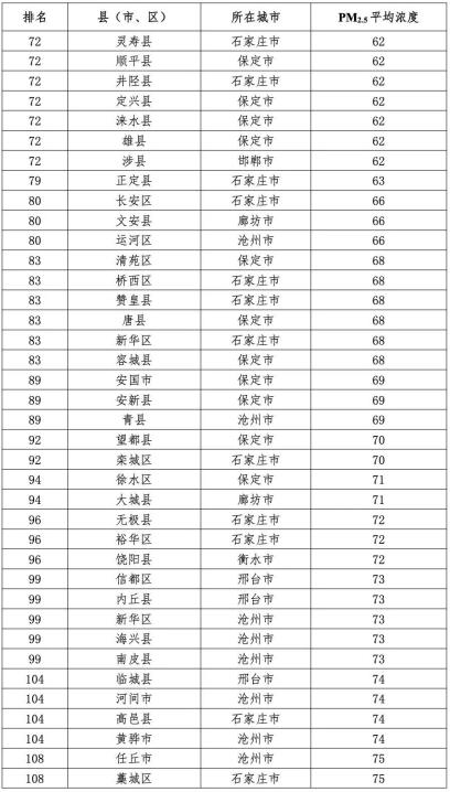 按空气质量综合指数由小到大的顺序,前20名县(市区)依次是:赤城县(1.91)、沽源县(2.20)、张家口市崇礼区(2.27)、康保县(2.36)、张北县(2.40)、张家口市万全区(2.51)、 张家口市桥东区(2.79)、围场满族蒙古族自治县(2.85)、张家口市桥西区(2.86)、怀安县(2.97)、尚义县(3.13)、涿鹿县(3.14)、 隆化县(3.15)、怀来县(3.19)、兴隆县(3.38)、宽城满族自治县(3.41)、丰宁满族自治县(3.53)、滦平县(3.67)、阳原县(3.68)、大厂回族自治县(3.70)。按PM2.5平均浓度(微克/立方米)由低到高的顺序,前20名县(市、区)依次是:沽源县(14)、赤城县(15)、张家口市崇礼区(16)、张北县(17)、张家口市万全区(19)、怀安县 (19)、康保县(19)、承德市双滦区(22)、张家口市桥西区(22)、 隆化县(23)、怀来县(23)、张家口市桥东区(25)、涿鹿县(25)、 围场满族蒙古族自治县(26)、兴隆县(26)、宽城满族自治县 (27)、大厂回族自治县(27)、三河市(27)、张家口市下花园区 (27)、滦平县(28)。