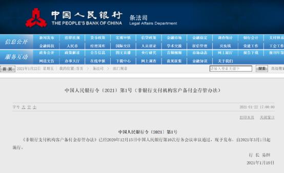 1月22日晚间,央行发布《非银行支付机构客户备付金存管办法》(简称《办法》),对非银支付领域进行严格监管,规范市场,保护消费者权益。该新规从今年3月起实施。