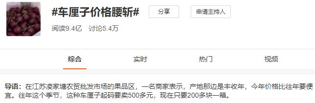 网红水果车厘子,因其味美清甜,一直受到消费者的喜爱。最近,受智利车厘子产量增加的影响,我国各地进口车厘子的销售价格出现大幅度的下跌。微博话题#车厘子价格腰斩#在热搜榜长居不下,达到9.4亿的阅读量。部分网友直呼“开心到飞起”“终于实现了车厘子自由”。