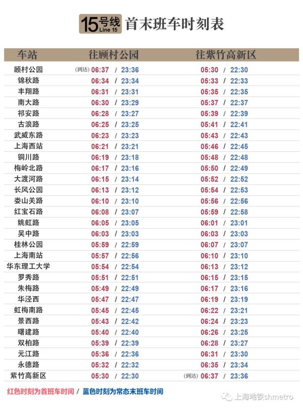 紫竹高新区站及顾村公园站首班车发车时间均为5:30