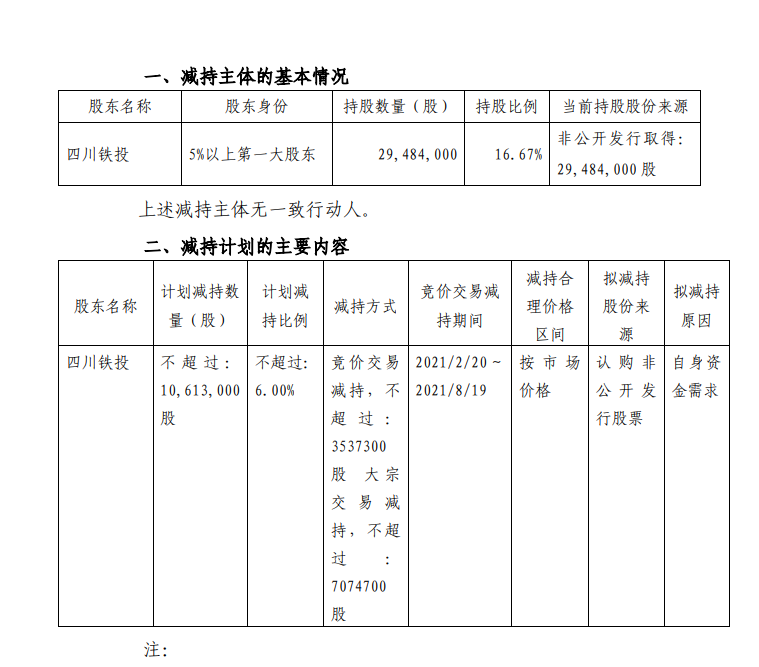 若按照1月22日的收盘价19.08元进行减持,四川铁投本次最多能够套现2.02亿元。