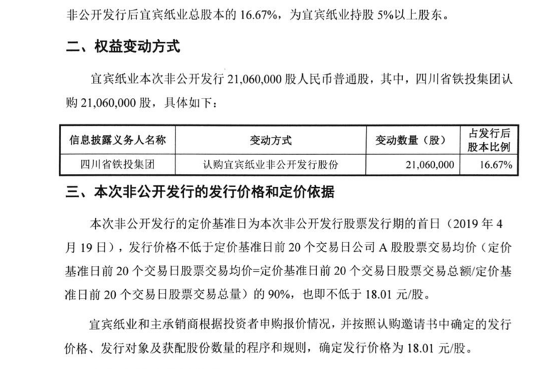 2019年5月,四川铁投认购宜宾纸业本次非公开发行股票2106万股,以发行价格18.01元每股计算,彼时认购总价3.79亿元,市值为3.64亿元。按最近的1月22日收盘价19.08元计算,四川铁投目前持有股份市值5.63亿元,浮盈1.84亿元。