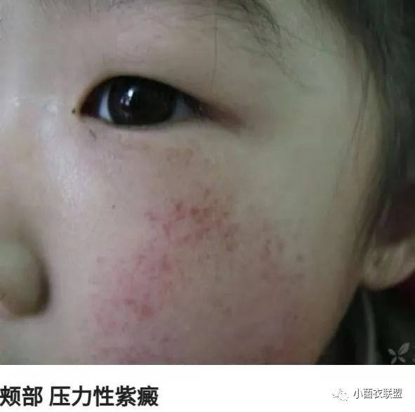 3.压力性紫癜:又称机械性紫癜,是由于局部肌肉剧烈收缩,血管内压突然升高,导致皮肤小血管破裂,红细胞外渗,引起紫癜。本病多见于儿童,常见的原因有剧烈咳嗽、呕吐、运动、哭闹等,发生于用力部位或受外力压迫部位,常见于面、颈、胸等组织疏松部位。临床表现为针尖大小、群集或散在的瘀点瘀斑,多无自觉症状。无需特殊治疗,皮损在去除诱因或压迫解除后数日消退。