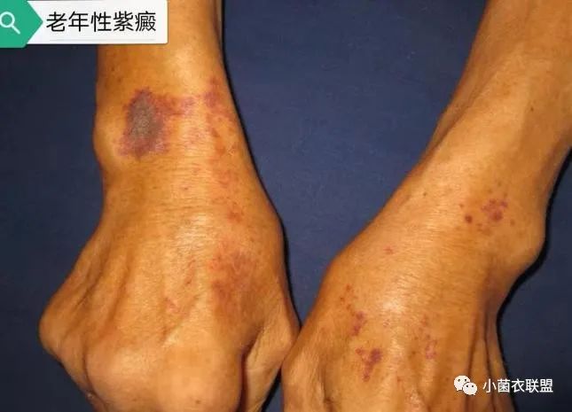 4.老年性紫癫:多见于老年人。是因为老年人皮下脂肪萎缩,皮肤松弛,弹性降低,以致轻微外伤、压迫后即可导致小血管破裂,红细胞外渗,形成紫癜。好发于暴露、易受外伤的部位如手背、前臂伸侧、小腿等。皮损为暗紫色瘀点或瘀斑,形态不规则,无自觉症状。持续数周后可自行消退,消退后留有色素沉着,也可复发。平时要注意营养饮食,避免摩擦、外伤,可口服维生素C。