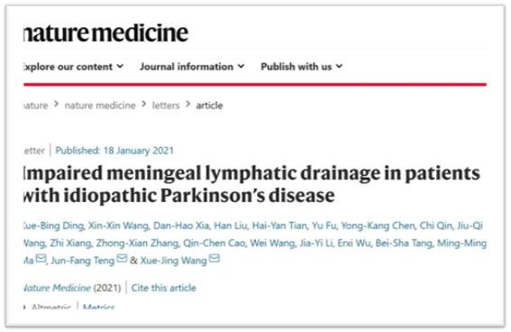 郑州大学王雪晶团队发现帕金森病新机制相关研究成果发表于国际顶尖期刊Nature medicine。郑州大学第一附属医院王雪晶教授团队于01月19日在国际顶尖期刊Nature medicine以 “Impaired meningeal lymphatic drainage in patients with idiopathic Parkinson’s disease” 为题在线发表帕金森病领域重大研究成果。