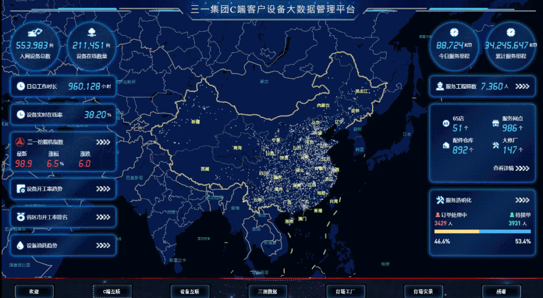 你可以看到,贵州遵义,一辆挖掘机刚刚结束了一天的辛勤工作。三一遍布全国的挖掘机,有的正在待工,有的正在忙碌,而各地实时变化的设备开工率汇聚到一起,就成了三一赫赫有名的“挖掘机指数”。2014年国务院领导视察三一,看到这个指数,要求他们每个月都要报送国务院,现在是每半个月报送一次。