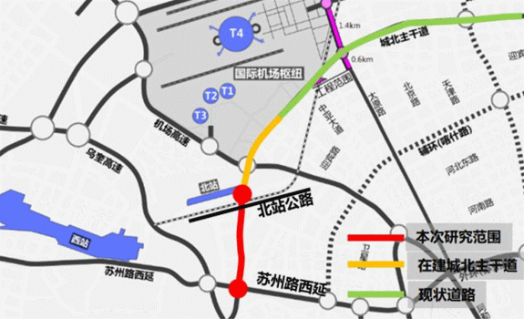 以高架+地面形式沿现状北站三路向北延伸