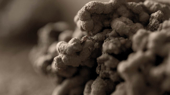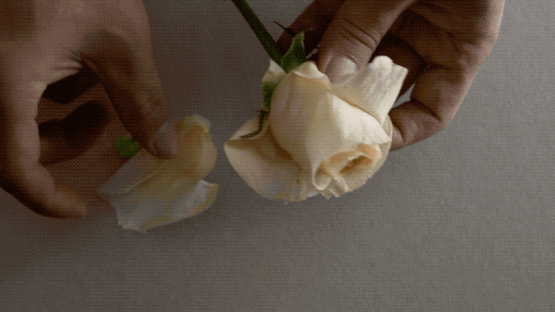 最后也最为关键的一步,还要用蚯蚓排泄出来的土,碾磨成灰色的颜料,为玫瑰花瓣“上色”。