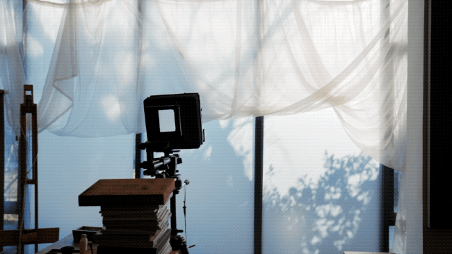 起床后,拍摄准备工作得一直忙到中午:测光、记录,构图,处理拍摄物体。准备妥当后,拍摄从中午开始,最难的地方有两个:一是背景,实际并不存在一个灰的对象,而是用充足的时间去曝光,在自然光配合下,去“调配”出灰色;二是所有地方都须实焦,因为一虚焦,空间景深感就出来了。
