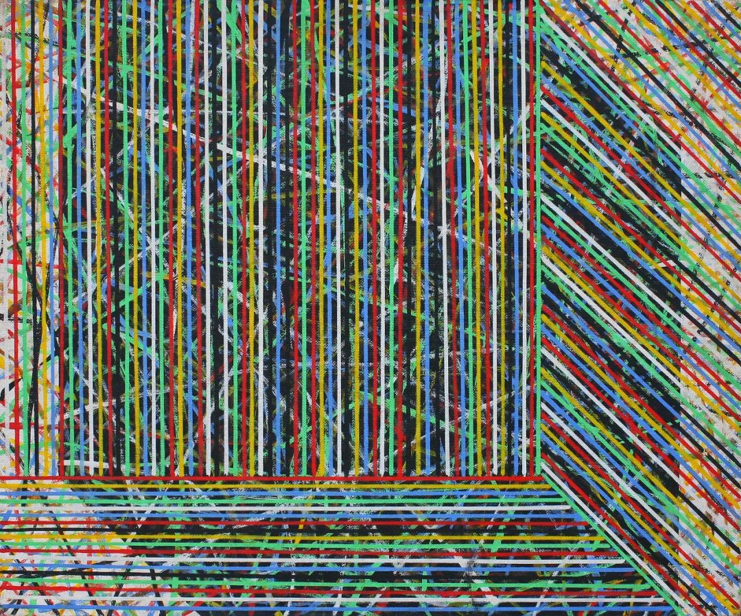 《线场》丙烯画 1992年到90年代,秦一峰渐渐安定下来做抽象画,有了第一个成熟的绘画系列《线场》,想要用线条,取消立方体的空间感,做成极致的平面。看似简单,但有丰富的视觉体验。