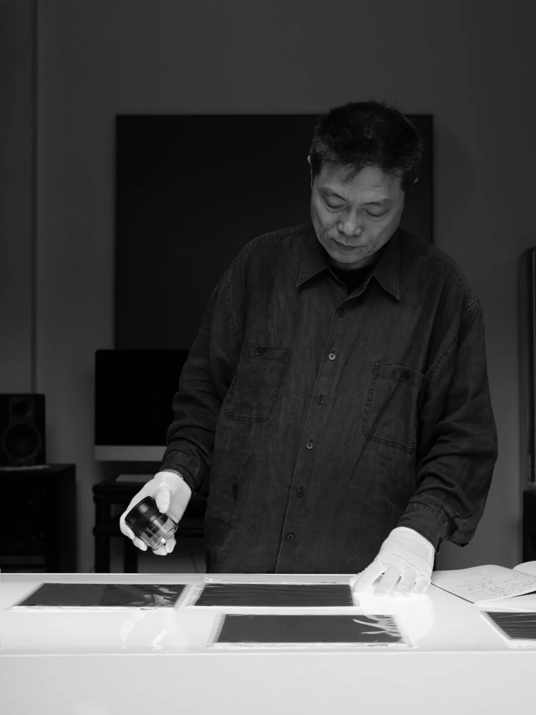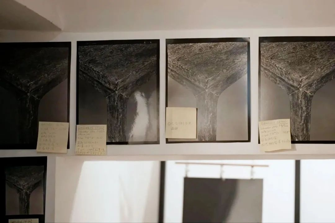 不同的拍摄位置、时间、曝光时长、用不同地区生产的胶片显影……最后一张自带“灰”的底片里,器物与空间、前景与背景,几乎被“压缩”进同一个平面。“30公分的桌角景深,终于给做平了。”秦一峰第一次认可了自己,为几张满意的负片,标记上黄色小圆圈。