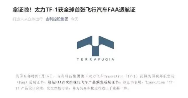 1月22日,吉利控股发布消息称,美国东部时间1月15日,吉利科技集团旗下太力飞车Transition(TF-1)获得美国联邦航空局(FAA)适航证书。